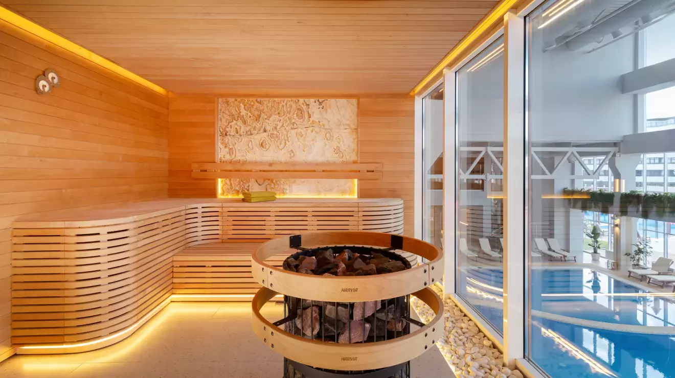Гостей ждут шесть видов парных, сенсорные комнаты с шезлонгами, зимний пляж и два бассейна — один с подогреваемой чашей, другой с видом на море и джакузи. На территории — площадки для йоги, большого тенниса и воркаута, а также станции зарядки электромобилей.