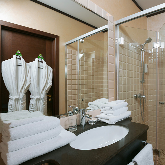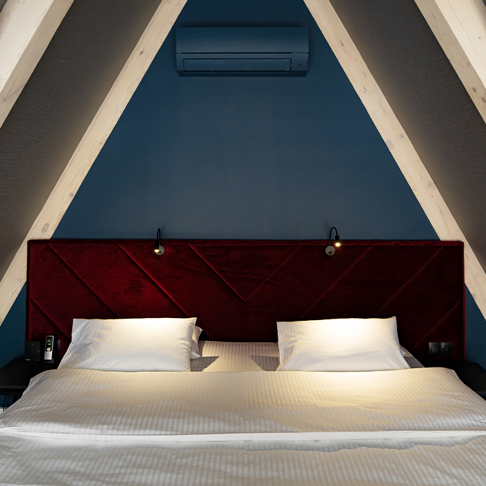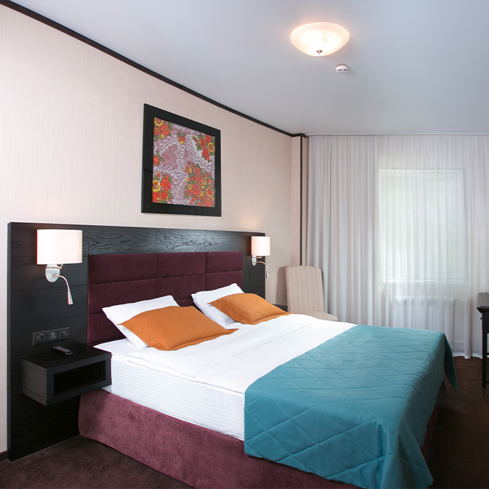 СТАНДАРТ 23 м2 Светлые и уютные номера состоят из спальни-гостиной и ванной комнаты. Оснащены системой кондиционирования воздуха, цифровым телевидением, сейфом, письменным столом и косметическими принадлежностями для комфортного проживания. ДВУХКОМНАТНЫЙ ЛЮКС 62 м2 Двухкомнатный люкс состоит из уютной гостиной с диваном и спальной комнаты с двуспальной кроватью. Номера оснащены системой кондиционирования воздуха, цифровым телевидением, сейфом, письменным столом и косметическими принадлежностями для комфортного проживания.