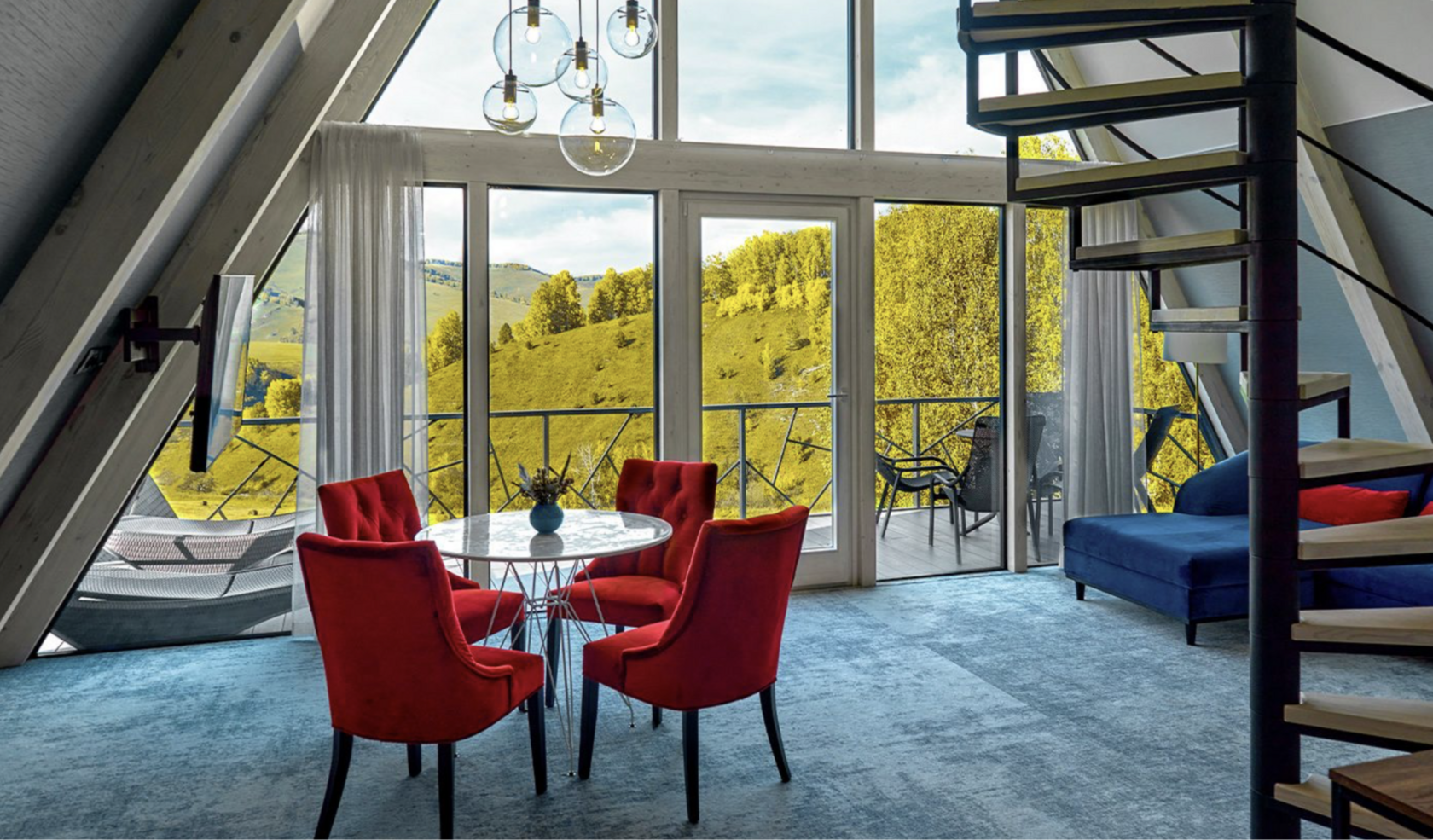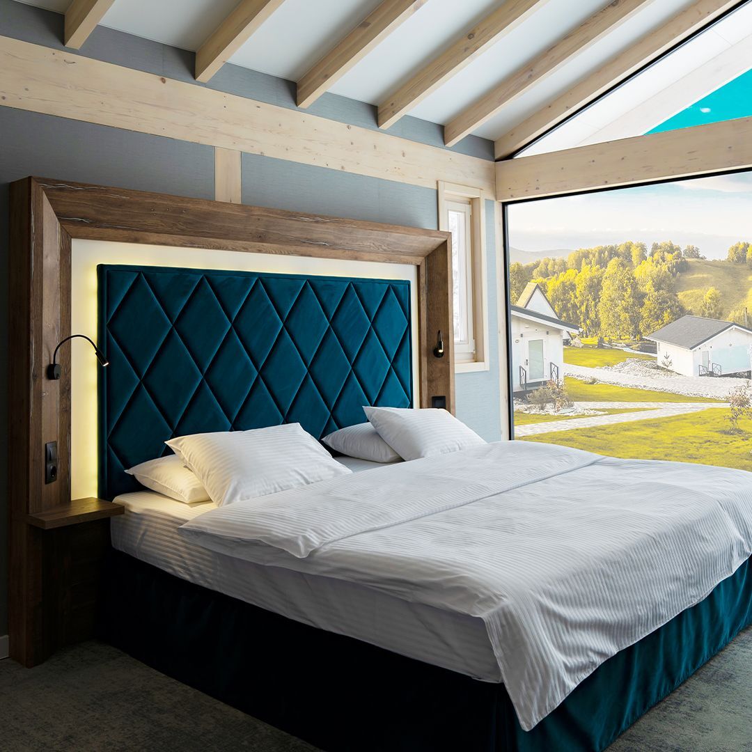 Alfa 65 м2 Номер высшей категории Джуниор Сюит (Шале Альфа). На мансардном этаже расположена большая двуспальная кровать, а на первом — две удобные полутороспальные кровати и диван-софа. Также на каждом этаже есть панорамные окна: вы сможете наблюдать за захватывающими красотами Алтая, занимаясь повседневными делами.