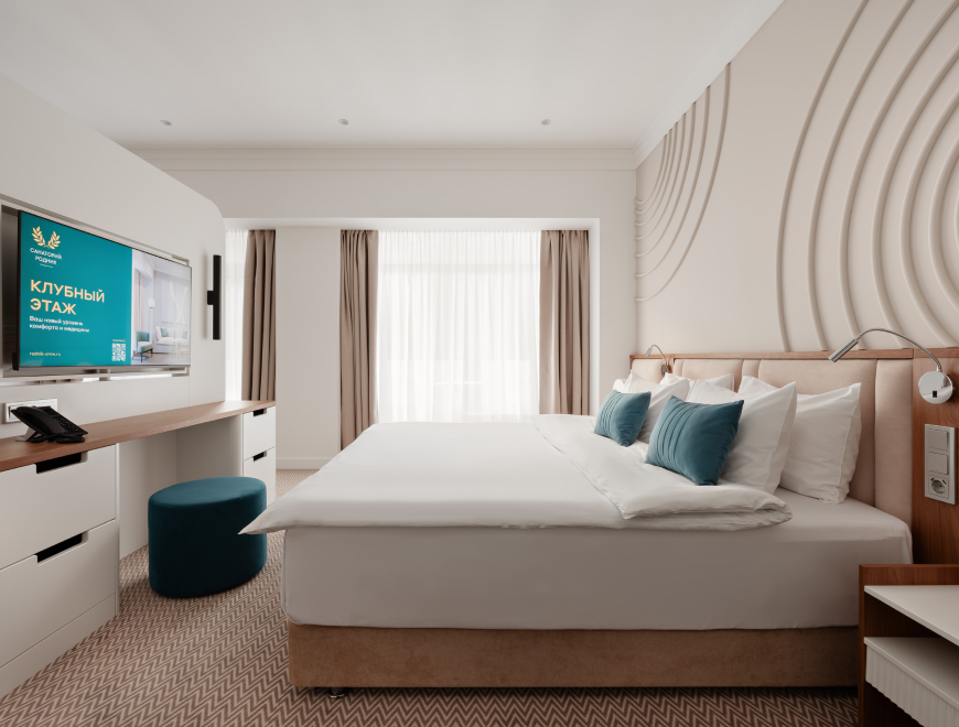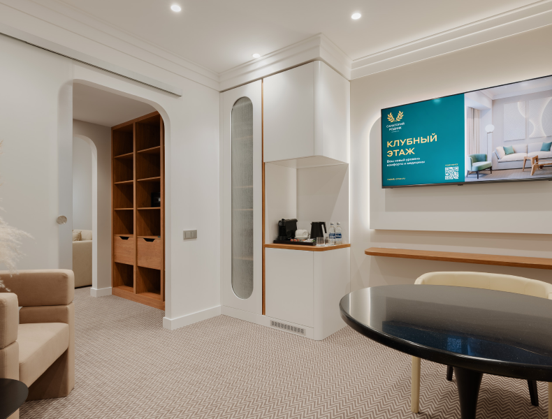 СТАНДАРТ (Клубный этаж) Уютный и светлый номер – идеален для спокойного отдыха вдали от городской суеты. Номера категории «Стандарт» коннекты (смежные) и могут быть объединены в двухкомнатные семейные номера, благодаря соединяющей их межкомнатной двери. НАПОЛНЕНИЕ НОМЕРА Две раздельные кровати с возможностью переоборудования в двухспальную кровать Встроенный шкаф Журнальный столик Холодильник Чайная станция (два вида чая), капсульная кофемашина Многоуровневое освещение Организованная рабочая зона Телевизор, цифровое, кабельное тв, wi-fi, телефон, кондиционер, сейф Гладильная станция, фен Гостевые принадлежности: халат, тапочки, гигиенические наборы по количеству гостей Оборудованная ванная комната (душевая) Для каждого гостя в номере предоставляется: 2 банных полотенца, 1 среднее полотенце, 1 полотенце для лица, 1 полотенце для ног. Косметические принадлежности премиум-класса Балкон со столиком и стульями ДЕЛЮКС (Клубный этаж) Элегантный номер увеличенной площади со свежим дизайнерским ремонтом и потрясающим видом на сказочный лес. Для максимального удобства проживания и отличного настроения, здесь есть просторный балкон, уютная гостевая зона и гардероб. НАПОЛНЕНИЕ НОМЕРА Двухспальная кровать Раскладывающийся диван Журнальный столик Многоуровневое освещение Организованная рабочая зона Гардеробная Гостевые принадлежности: халат, тапочки, гигиенические наборы по количеству гостей Чайная станция (два вида чая), капсульная кофемашина Холодильник Телевизор, цифровое, кабельное тв, wi-fi, телефон, кондиционер, сейф Гладильная станция, фен Оборудованная ванная комната (ванна) Для каждого гостя в номере предоставляется: 2 банных полотенца, 1 среднее полотенце, 1 полотенце для лица, 1 полотенце для ног. Косметические принадлежности премиум-класса Просторный видовой балкон со столиком и стульями ЛЮКС (Клубный этаж) Стильный и просторный номер располагается на самом роскошном этаже санатория и создан для отдыха в окружении премиального комфорта и приватности. Огромные панорамные окна, балкон, откуда открывается вид на Курортный парк, не оставят равнодушными даже самых взыскательных Гостей. НАПОЛНЕНИЕ НОМЕРА Двухспальная кровать «King size» Раскладывающийся диван Журнальный столик, 2 штуки Многоуровневое освещение Организованная рабочая зона Софа в прихожей Кресло (не раскладывается) Гардеробная Гостевые принадлежности: халат, тапочки, гигиенические наборы по количеству гостей Обеденный стол Стулья мягкие, 3 штуки Чайная станция (два вида чая), капсульная кофемашина Холодильник Телевизор, цифровое, кабельное тв, wi-fi, телефон, кондиционер, сейф Гладильная станция, фен Оборудованная ванная комната с ванной и биде Гостевой туалет Для каждого гостя в номере предоставляется: 2 банных полотенца, 1 среднее полотенце, 1 полотенце для лица, 1 полотенце для ног. Косметические принадлежности премиум-класса Просторный видовой балкон со столиком и стульями