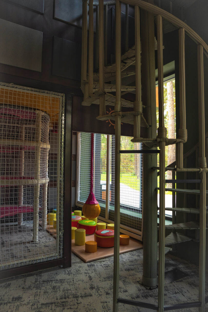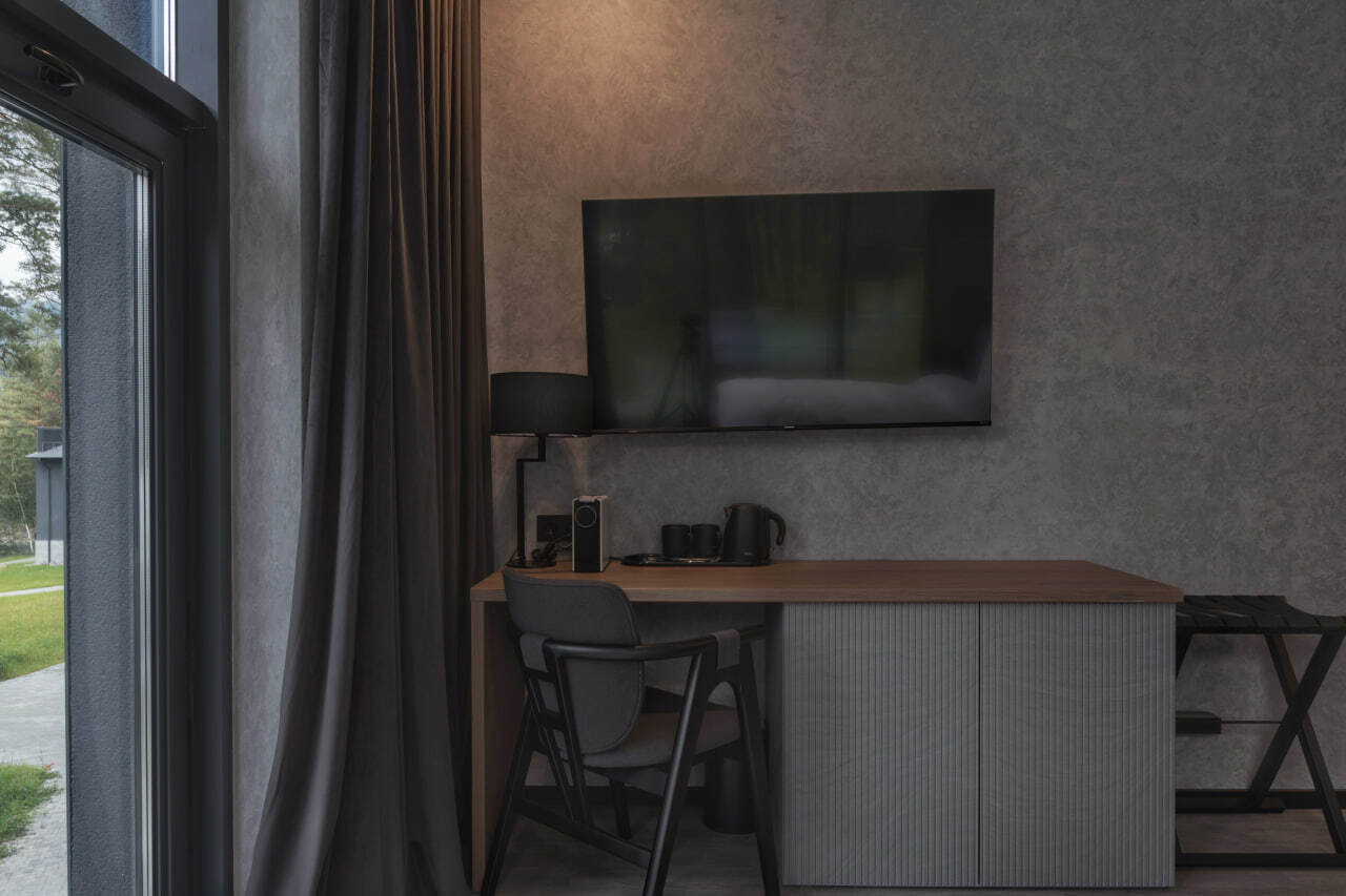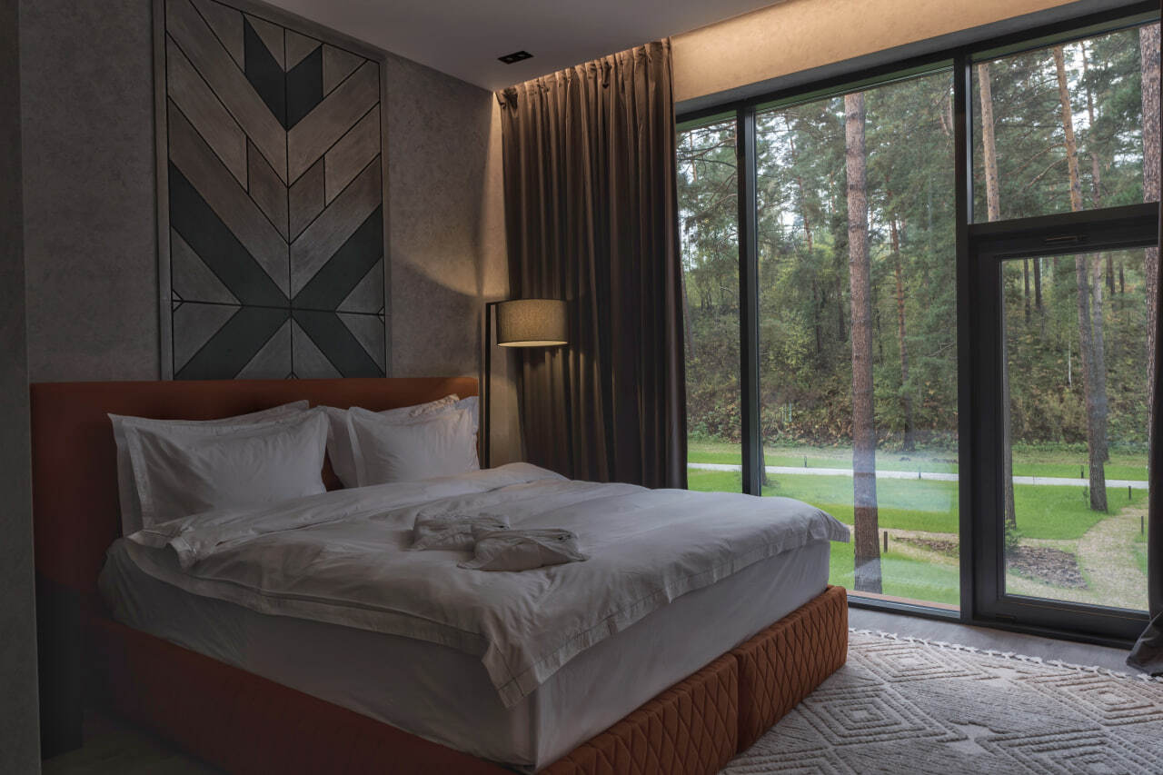 Делюкс, 25 м² Самый просторный номер в категории «Делюкс» с панорамными окнами и видом на реку или лес. Предусмотрены номера-коннекты для удобного размещения семьи. Размещение: 2 взрослых + 1 ребёнок до 5 лет (без доп. места) или 1 ребёнок 6–18 лет (на доп. месте за доп. плату). Комплектация: чайная станция, бутилированная вода, ЖК-телевизор, Wi-Fi, сейф, фен, гигиенические принадлежности, полотенца, халаты и тапочки, шторы блэкаут. В общем холле — утюг и отпариватель.