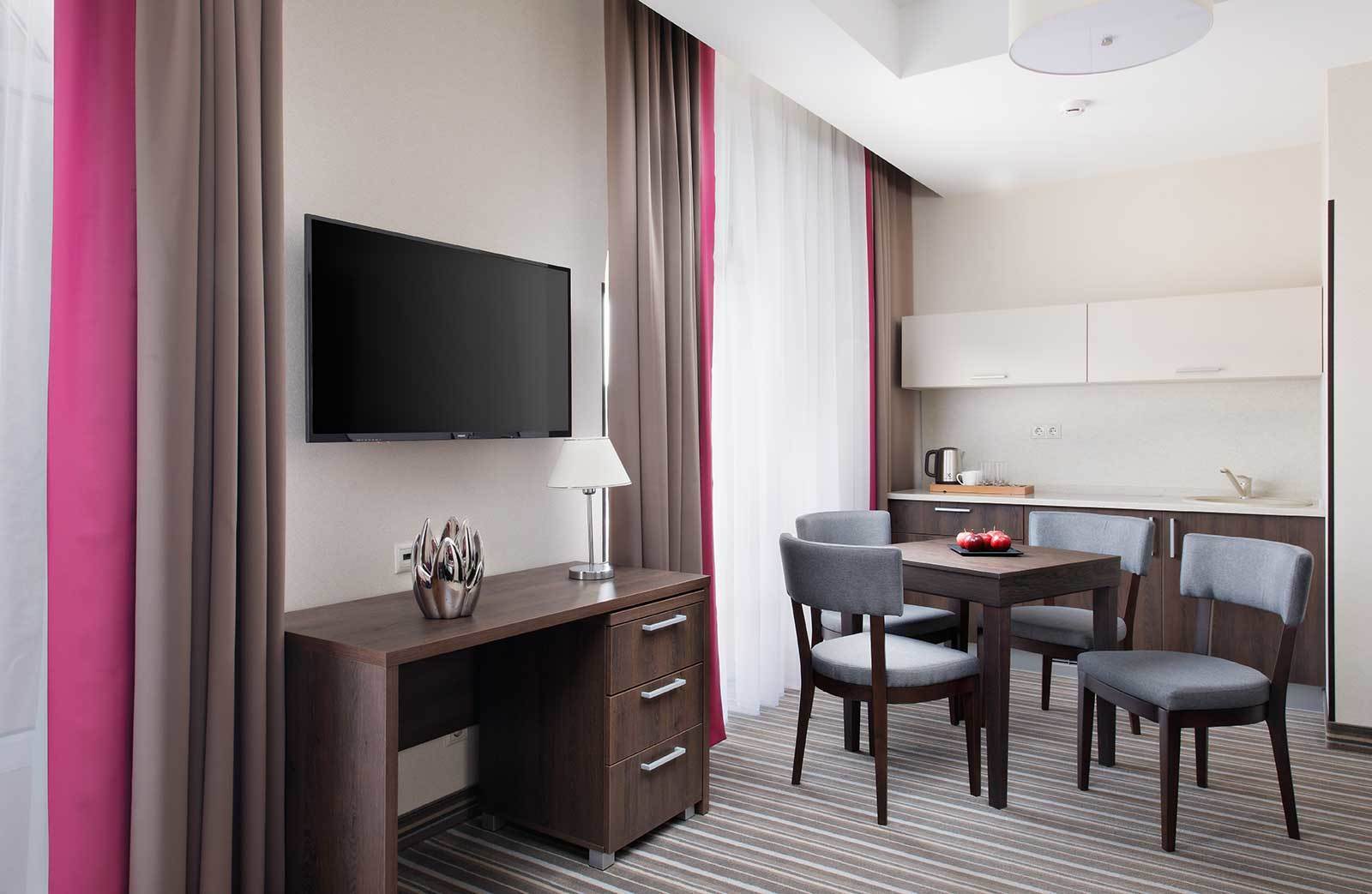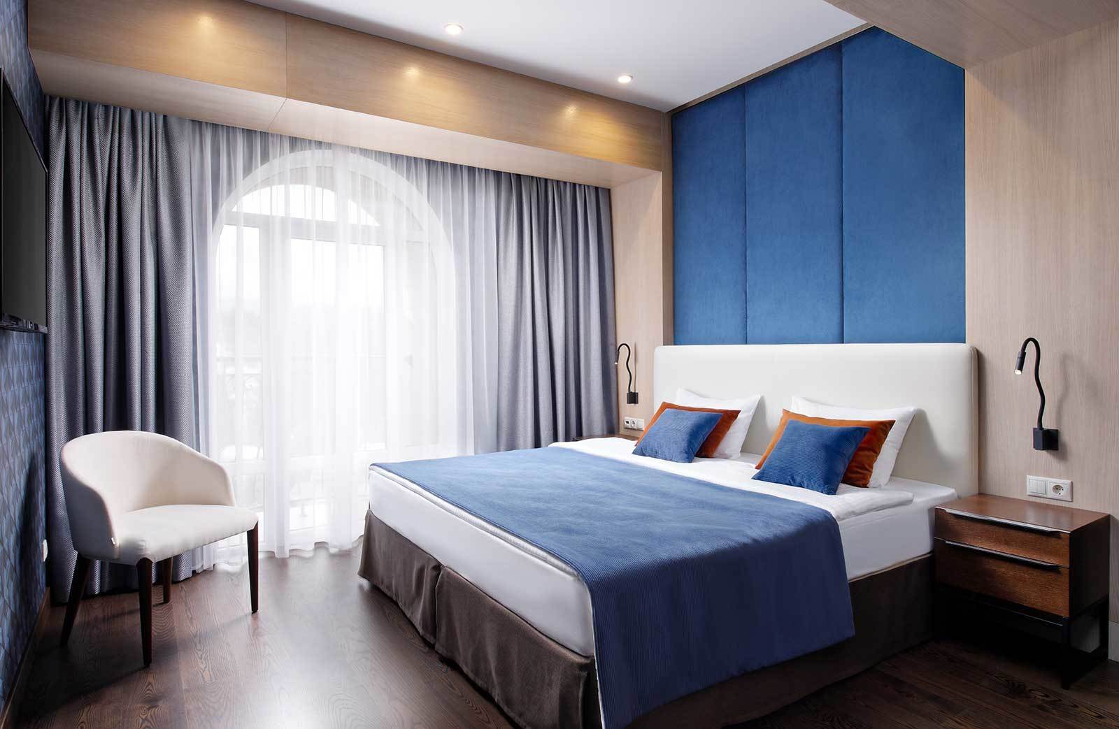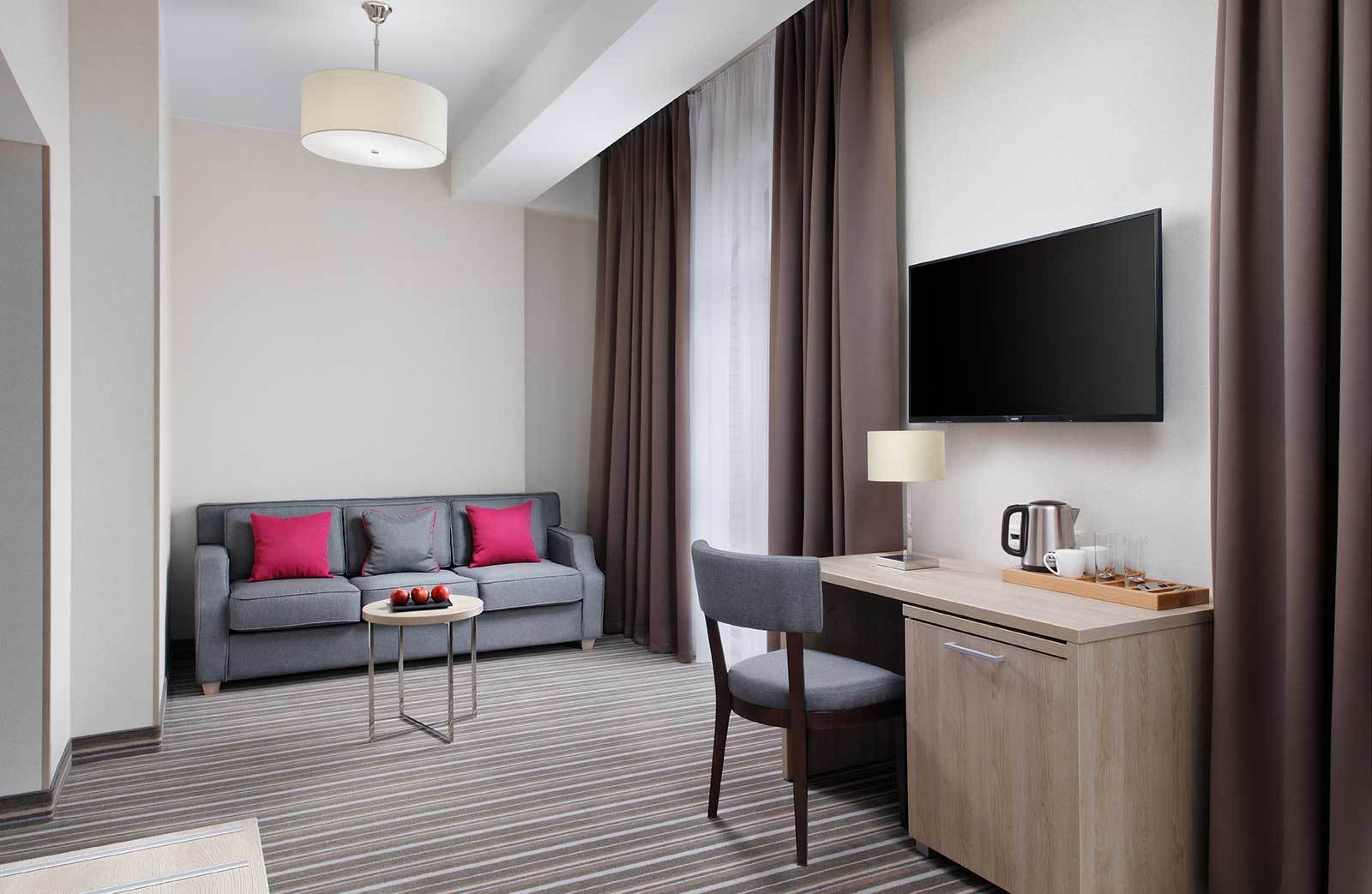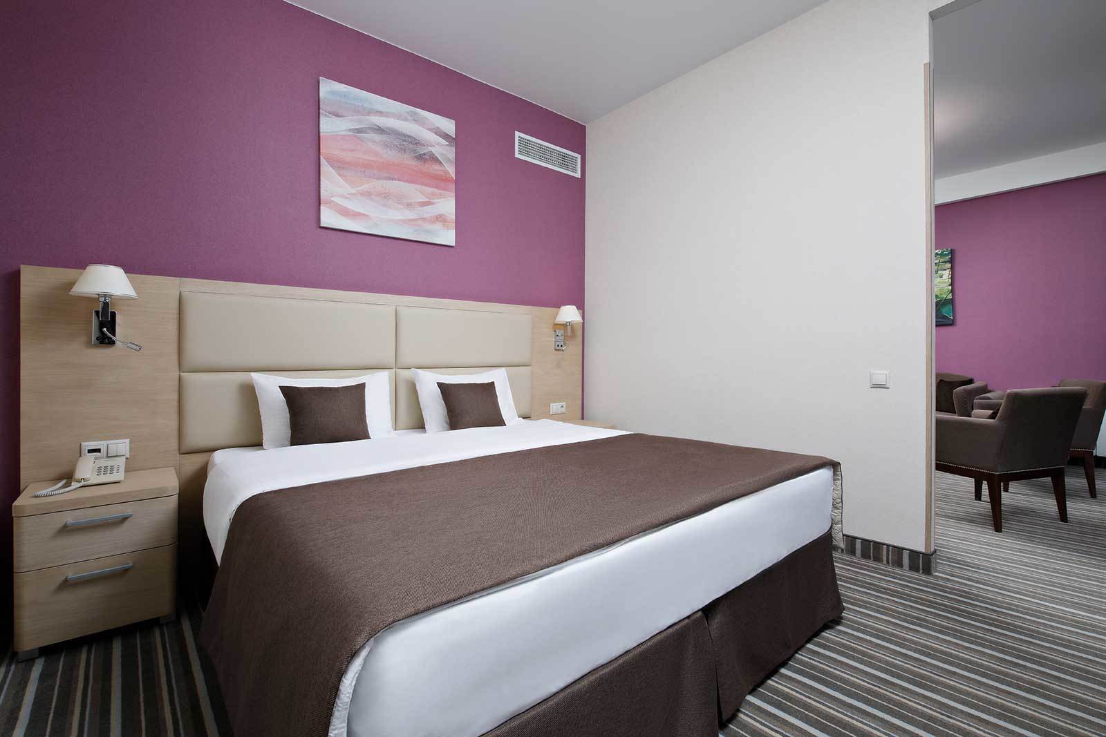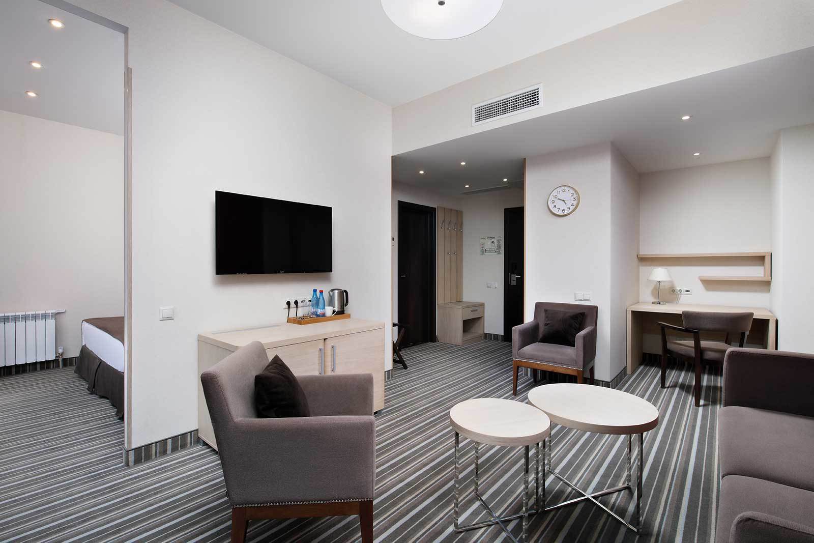 ДЖУНИОР СЮИТ Однокомнатный, до 4-х гостей Спальное место на выбор: Двуспальная кровать 180х200 Две односпальные кровати 90х200 Площадь номера: 31 м²