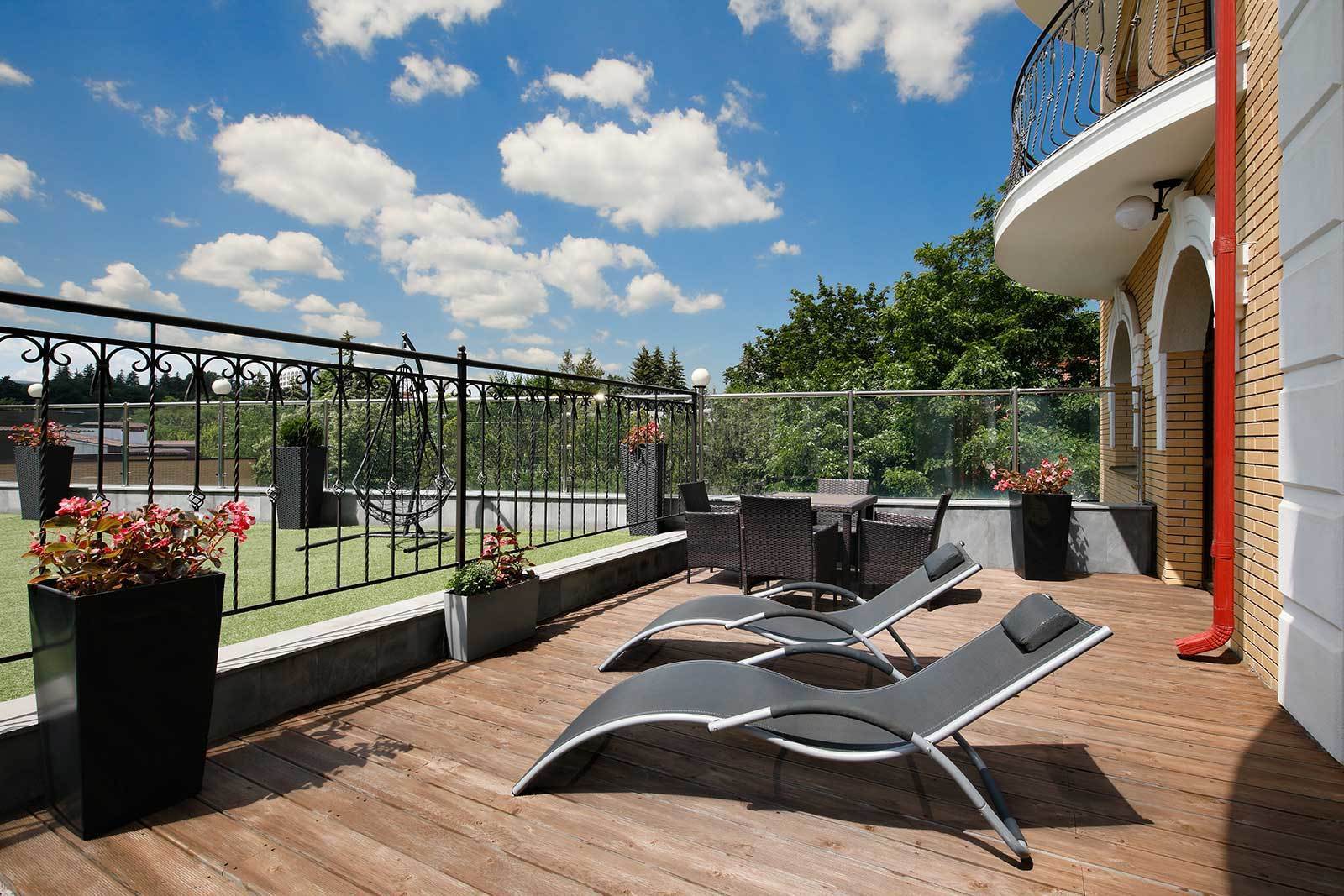 СТУДИЯ С ТЕРРАСОЙ Однокомнатный, до 4-х гостей Спальное место на выбор: Двуспальная кровать 200х200 Две односпальные кровати 100х200 Площадь номера: 47 м²