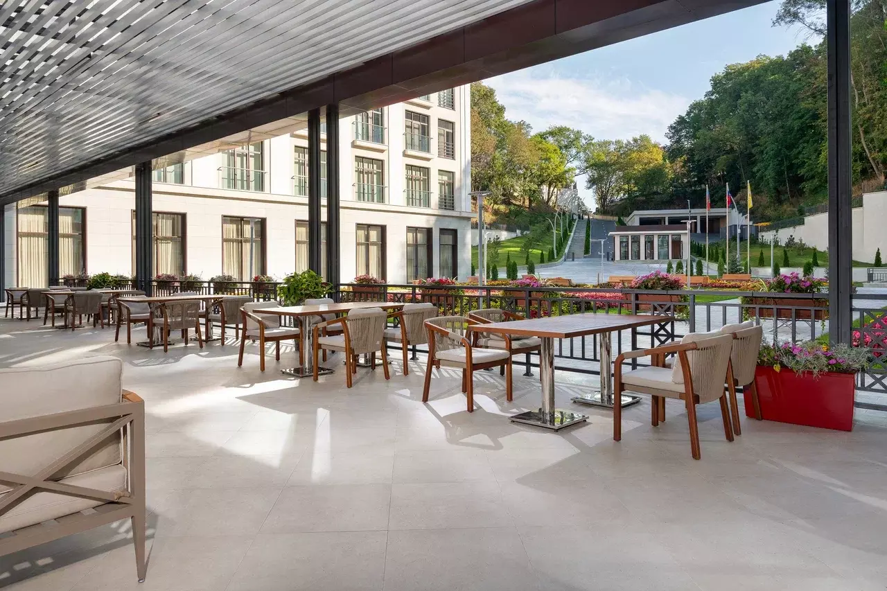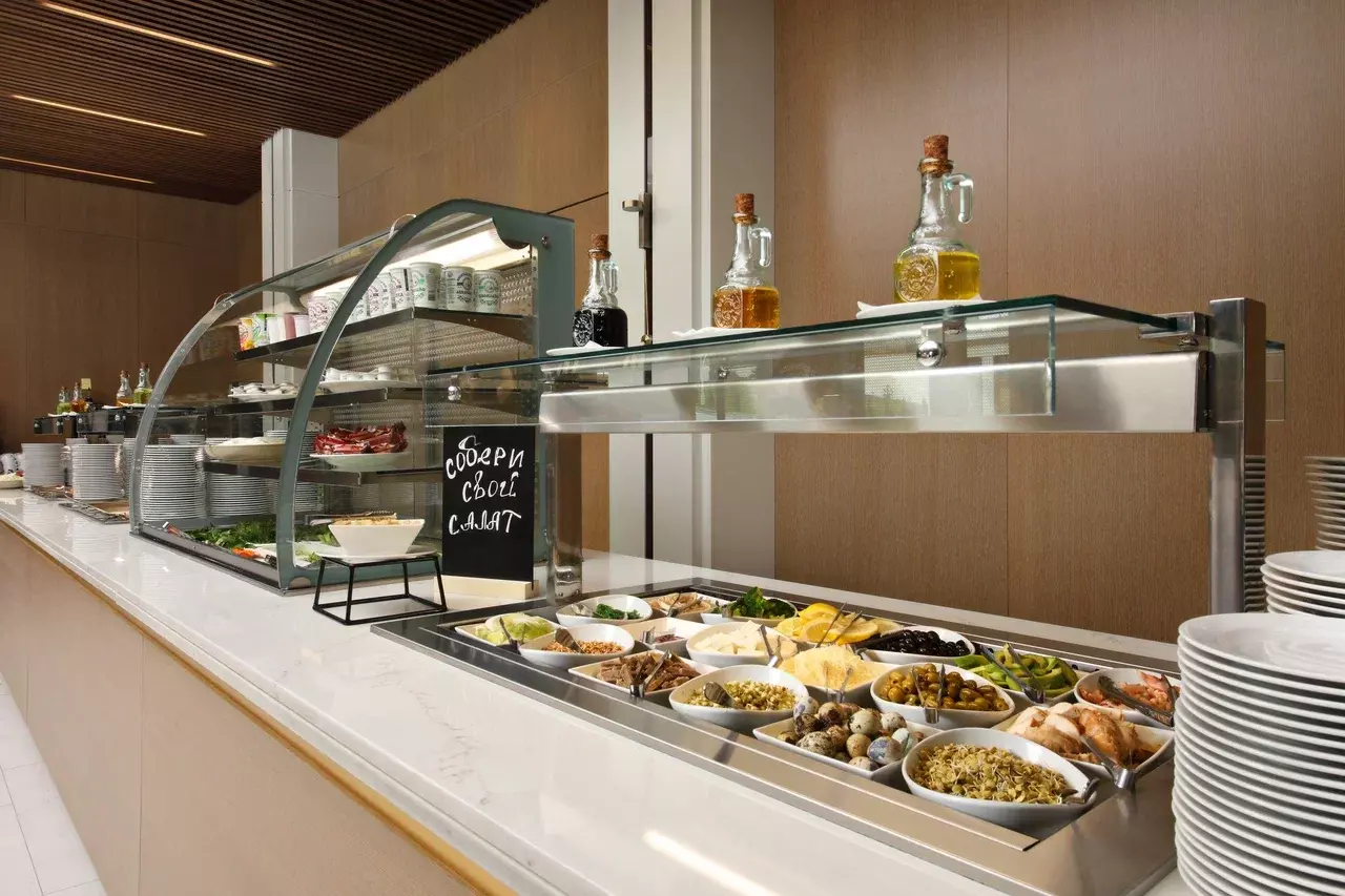 Ресторан «Бон аппетит» — «шведский стол», меню формируется совместно с диетологом; для «Делюкс Элегант» — отдельный зал. Часы работы: завтрак 08:00–10:00, обед 13:00–15:00, ужин 18:00–20:00. Лобби-бар — напитки и закуски, ежедневно 08:00–24:00. VIP-зал — для категорий Сюит Модерн / Сюит Прайм / Премьер / Люкс. Room service — ежедневно 10:00–22:00.