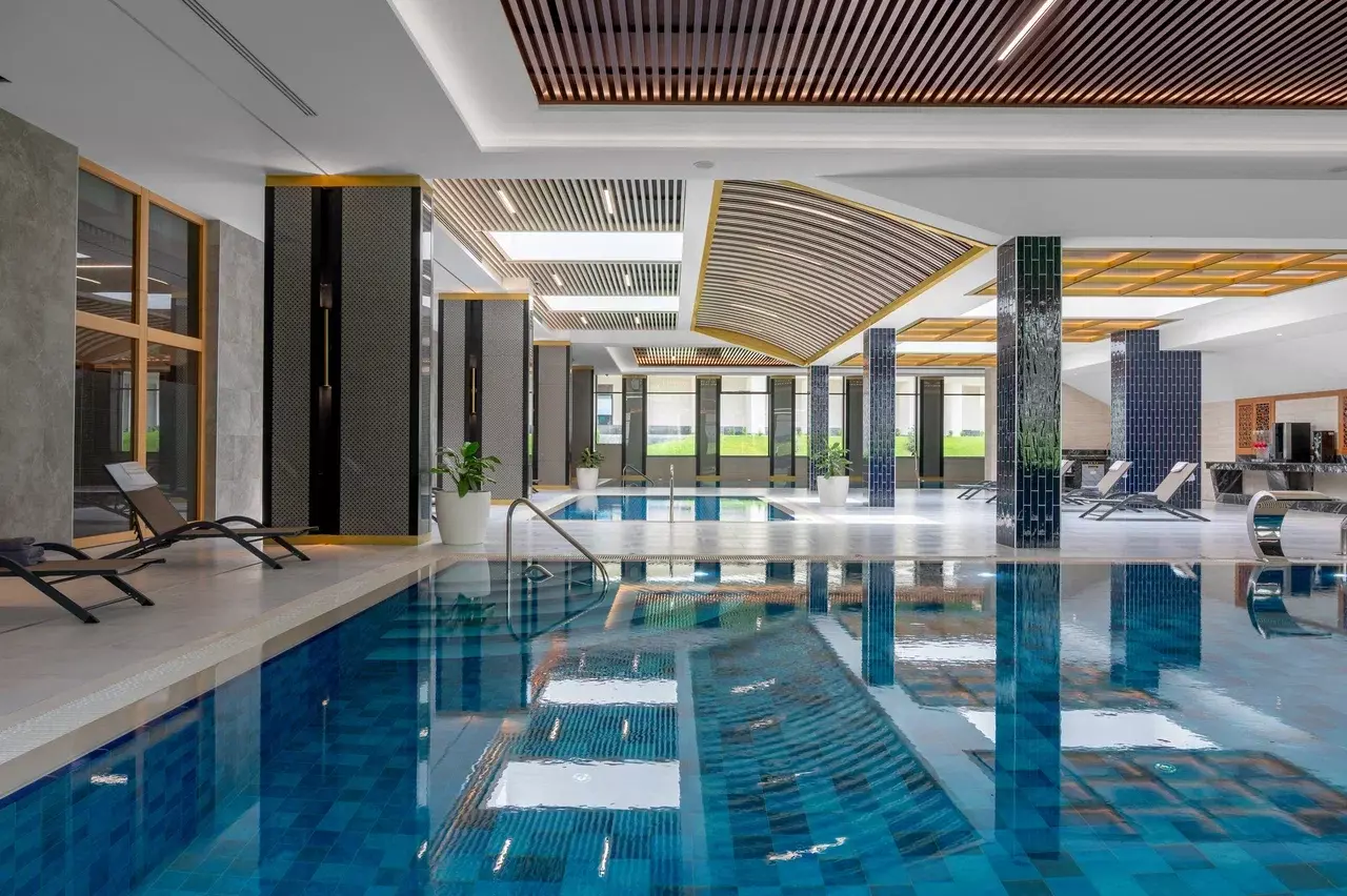 Акватермальный комплекс «Аква FIT» Полноценная зона релакса и оздоровления круглый год. Бассейны: 2 прямоугольных взрослых бассейна — 20×9 м, глубина 1,4–1,6 м; детский бассейн — 8×5 м, глубина 0,5 м; 2 VIP-бассейна овальной формы — взрослый ~104 м², глубина 1,6 м; детский ~74 м², глубина 0,6 м. Параметры воды: +28 °C; многоуровневая фильтрация (песочные фильтры общей массой ~2 т, УФ-установки, pH-коррекция) — кристальная прозрачность и безопасность. Зоны для свободного плавания, аквааэробики и водных восстановительных практик.