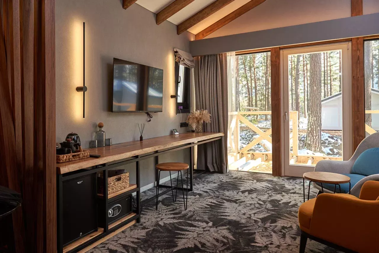 Шале, 38 м² Просторный однокомнатный номер с панорамными окнами, открывающими вид на первозданную природу Алтая. Интерьер выполнен в светлых тонах с использованием натуральных материалов. Размещение: до 2 основных мест + 1 дополнительное. Оснащение: двуспальная кровать, прикроватные столики, телевизор, рабочее место, кресла, шкаф, чайно-кофейная станция, санузел с душевой кабиной, багажное отделение, ванные принадлежности, халаты и тапочки.