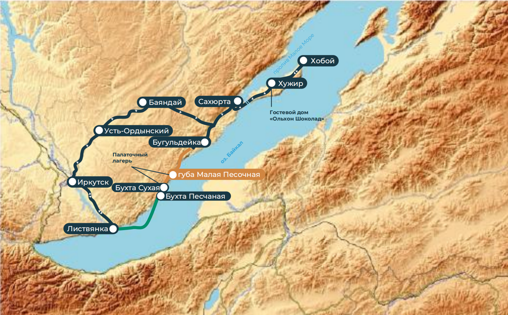 День 3 Маршрут п. Хужир — п. Сахюрта — п. Бугульдейка — начало тропы 40 км на автомобиле УАЗ 2 км на пароме 90 км на микроавтобусе 3-4 км пешком Проживание: палаточный лагерь Питание: завтрак в отеле, обед-перекус, ужин (полевая кухня) Сегодня вас ждет: